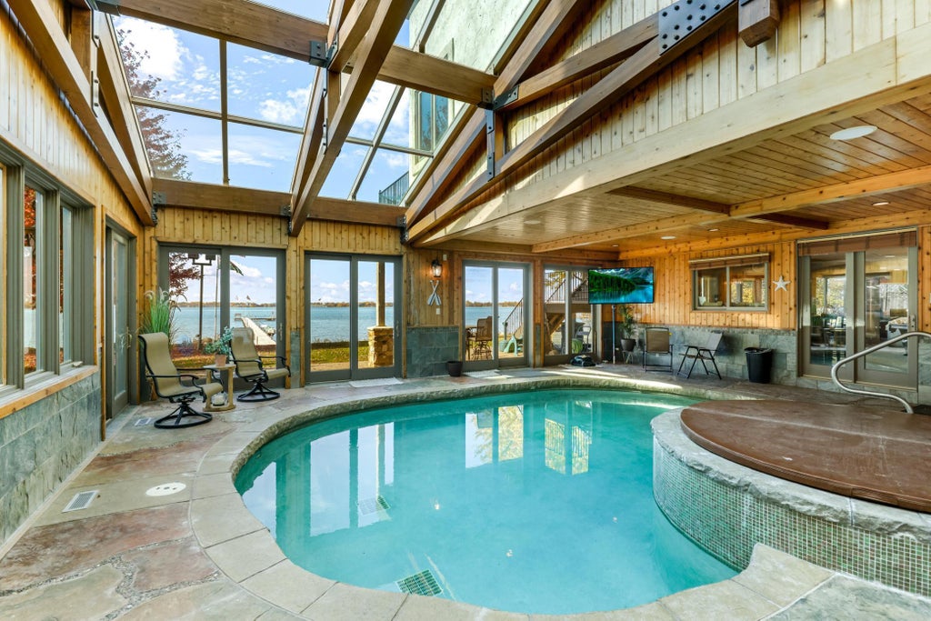 Luxury Waterfront Home with Stunning Sunsets & Private Retreat. Experience the ultimate in lakeside living at this executive two-story, 6-bedroom, 6-bathroom estate nestled on a private lot along Forest Lake’s pristine shores. Boasting 9,641 finished square feet, this home offers expansive views of the lake, the finest sandy beach, and nightly sunsets to enjoy from a 300+ foot dock (valued at $200,000). The property is bordered by serene wetlands, ensuring privacy with no neighbors behind you. Step inside the grand two-story foyer, complete with maple floors, a sweeping staircase, and decorative ledges that welcome you with warmth and elegance. The executive office, situated just off the entrance, features glass French doors, built-in cabinetry, and dual workstations, making it ideal for working from home. Adjacent, the formal dining room, complete with a butler's pantry or coffee bar, offers space for memorable gatherings and all your entertaining needs. The main floor family room impresses with a soaring 22-foot stone-front gas fireplace and breathtaking lake views, creating a cozy yet majestic atmosphere. The gourmet kitchen includes Cambria countertops, a tile backsplash, stainless steel appliances (including a built-in refrigerator and beverage cooler), a cooktop with vented hood, convection microwave, and wall oven with a warming drawer. A lakeside breakfast nook, with bay windows and a vaulted cathedral ceiling, is the perfect spot for morning coffee with lake views. The amazing Trex deck and custom paver patio both span the whole back of the home for your enjoyment! The main floor primary suite offers a gas fireplace, access to the outdoor deck, a spacious walk-in closet with built-in dressers, and a private washer and dryer. The spa-like bathroom features a jetted tub, a full tile steam shower, a double vanity, a makeup counter, and a private toilet room with a bidet. Upstairs, a dramatic catwalk leads to a loft ideal for a reading nook or a baby grand piano, overlooking both the foyer and family room. The upper level includes five additional bedrooms, two bathrooms, and a full laundry room, providing abundant space for family and guests. What makes this home unique is the lower level, which is designed for entertainment, with a spacious family room, a gas fireplace, and a custom 200 gallon saltwater aquarium with the home’s mascot, an amazing puffer fish included. A billiards area, perfect for games, is complemented by a full bar with Cambria countertops, a tile floor, dishwasher, refrigerator, and ice maker. The home gym offers space for exercise, while the pool and hot tub room—with its glass greenhouse ceiling—provides an oasis to relax and rejuvenate. This space also includes a 3/4 bathroom with a walk-in tile shower, washer and dryer, and ample locker storage. Additional features include 10-foot main floor ceilings, central vacuum, full security system with and intercom systems, smart thermostats, Crestron lighting system, ethernet and 2 wifi boosters, osmosis water treatment system, in-floor heating in the lower level and bathrooms, three separate furnaces, three laundry rooms, three fireplaces, epoxy-floored heated garages (two car attached with in floor heat and trough drain, three car detached with a 544 sq. ft. bonus room with living quarters), and a whole-house generator for peace of mind. Don’t miss your chance to own this one-of-a-kind luxury retreat on Forest Lake, offering the best in privacy, amenities, and waterfront living.