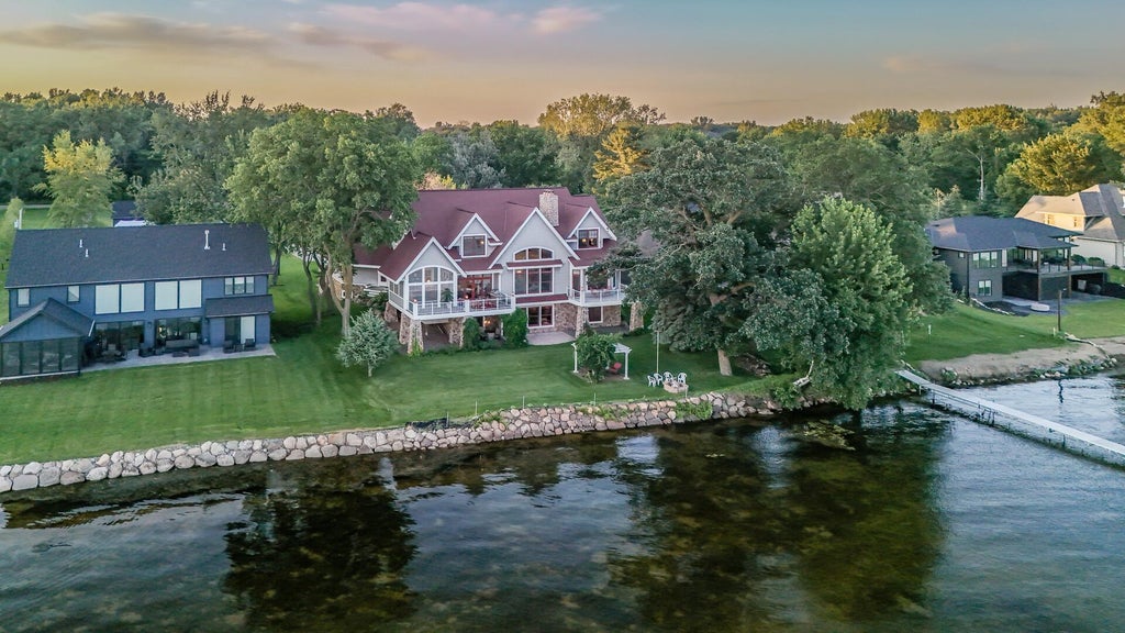 Welcome to a once-in-a-lifetime opportunity on Forest Lakes coveted “Gold Coast” — a custom-built lakeshore estate designed to feel like a timeless 1920s seaside cottage. Crafted in 2005, this one-of-a-kind home rests on a beautifully landscaped 550’ deep lot with 100’ of south-facing sandy shoreline on Forest Lakes desirable First Lake. Positioned 400’ off the road, the home offers serenity, abundant natural light, and gentle summer breezes—just minutes from local amenities, the freeway for an easy commute, and 35 minutes to the Twin Cities. Designed by renowned architect Ben Nelson, the home showcases superior craftsmanship with 12” precast Spancrete floors, TimberStrand framing, and in-floor radiant heat on all three levels (excluding the upper garage and guest apartment). Energy-efficient features include 2x6 walls, Corbond foam insulation, Owens Corning Berkshire shingles, maintenance-free Nailite siding & Azek trim. There are 6 exceptionally large bedrooms and 7 bathrooms, each with a private ensuite and walk-in closet—perfect for multi-generational living or extended guests. One lower-level bedroom is currently used as an office with its own ensuite and walk-in closet. The spectacular great room features soaring cathedral ceilings, a floor-to-ceiling stone gas fireplace, custom built-ins, and panoramic lake views. From here, it's common to see majestic eagles gliding across the water, adding to the serene setting. The main-floor primary suite offers a private lakeview balcony, marble fireplace, jetted tub, rain shower, dual marble sinks, a walk-in closet, and nautical porthole window with patio seat. The chef’s kitchen boasts a 6-burner Viking range, double wall oven, Miele panel-front dishwasher, granite island, copper ceiling, and custom cabinetry. Adjacent are the formal dining room and cozy breakfast space. The main-floor laundry features Zodiac blue quartz counters, washer/dryer, sink, and a laundry chute. Enjoy year-round lakeside living in the 3-season porch with vaulted ceiling and E-Z Breeze window system, plus a maintenance-free Azek deck added in 2023. Every space reflects thoughtful design and timeless comfort. The private guest apartment above the garage has access from the loft and a separate entrance from the main-level garage, offering flexible privacy. It includes a full kitchen, dining area, bedroom, ¾ bath with full tiled shower, hickory floors, skylight, and baseboard heat—ideal for in-laws, guests, or independent living.