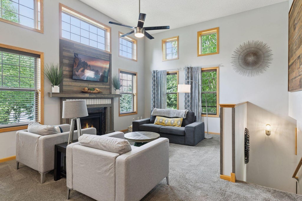 This distinctive, multi-level townhome offers a rare combination of architectural interest, custom wood finishes, and everyday functionality, all in a beautiful, low-traffic neighborhood surrounded by mature trees and green space. The main living level stuns with 12-foot ceilings, floor-to-ceiling windows, and an open concept design that floods the space with natural light. In the living room, a cozy gas fireplace with a handsome wood mantel surround is a desirable amenity, while the spacious kitchen features hardwood floors and granite countertops amongst tile backsplash and solid wood cabinetry, as well as a handy center island and pantry. Upstairs, you’ll find two bright bedrooms and two full baths, including the primary suite with a walk-in closet and in-floor heated bath, as well as a conveniently located laundry room and built-in workstation that’s perfect for a designated study or workspace. Make your way to the walkout lower level and be pleased to find a flexible space for a family or exercise room outfitted with premier gym flooring, the third bedroom, and a ¾ bath with in-floor heat- all ideal for entertaining guests, a home office and more! Plus, the outdoor space is just as pleasing with a west-facing balcony deck offering afternoon sun and privacy with mature tree coverage, while the end-unit location provides extra yard space in a peaceful natural setting. You can also appreciate a two-car attached garage, complete with a full wall of built-in shelving for extra storage, low-maintenance living with the HOA-covered exterior care, and new roof and siding. And don’t miss the fantastic community amenities that include a clubhouse with exercise room, outdoor pool, and playground, not to mention immediate connection to walking/bike trails and easy access to I-94 and all that Woodbury and its surrounding cities have to offer. A standout property offering space, light, privacy, and comfort, this home is anything but ordinary.