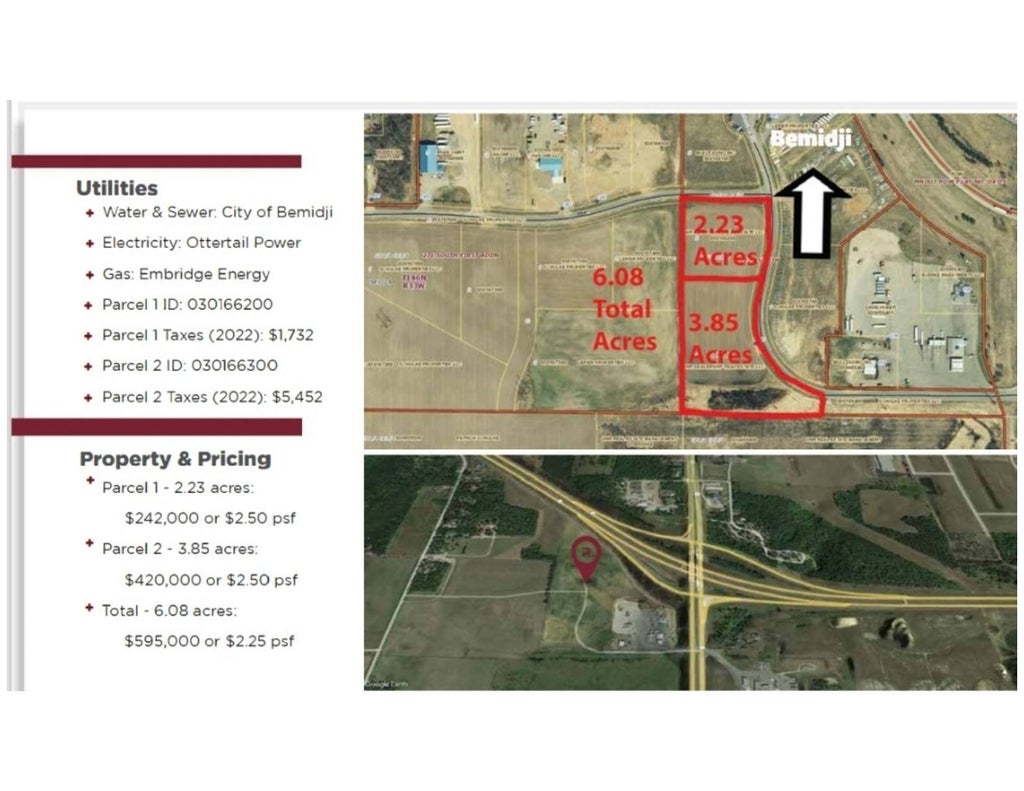 Approximately 6.08 acres of land for sale in Bemidji. Located directly off of heavily traveled Highway 2 and Highway 71. This site has excellent visibility from Highway 2 with easy off and on access. Parcels can be combined or split with zoning that allows for a wide variety of use. This property is idea for automotive, equipment or accessory dealerships.