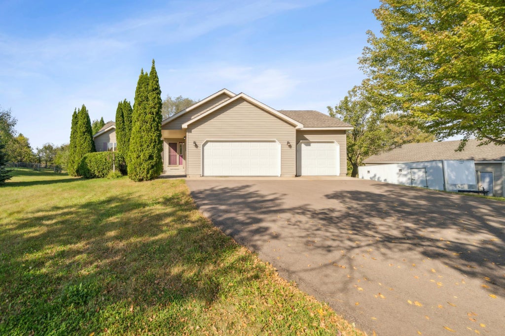 Solid built rambler w/9 foot poured walls & a fantastic floor plan including vaulted living/dining/kitchen, open kitchen w/center island & awesome cabinet space! Main floor offers primary w/private bath plus additional bedroom & full bath! Lower level has 3rd oversized bedroom plus full bath, NEW bar cabinets & tub tile in bath! 2 cozy gas fireplaces- 1 on each level! Cool details like 3/4" solid oak floor in living room, sun filled operational skylights, high end custom wood trim casings/base, 6 panel solid oak doors, interior walls insulated for sound & tons of updates-see supplements. Lovingly maintained: NEW roof w/35 year shingles (2025), carpet/flooring, Andersen patio door, driveway, hot water heater & more! BONUS 28x42 insulated, heated shop that has been rented for 10+ years. Option for renter to continue (new owner will negotiate). See agent for more info! Fabulous almost 2 acres w/mature walnut/butternut trees, apple & pear too! Boundaries extend past fenced area. See today!