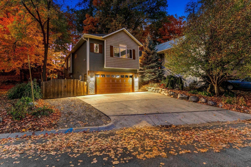The home is essentially a reverse walk-out rambler where the lower level walks out of the front at grade and the upper-level walks out of the back at grade. The main level features 9’ ceilings with an open floorplan and all living facilities, including a beautifully renovated kitchen with custom millwork to include additional storage in the soffit and bench seating, hardwood floors, and a cozy gas fireplace with a natural stone surround. Large windows frame serene backyard nature views, while east-facing windows in the primary bedroom welcome the morning sun. A laundry closet is conveniently located near the two main level bedrooms. The lower level offers a 3rd bedroom, which is currently configured as a family room space, complete with wiring for surround sound, noise reducing insulation and an electric fireplace. Historically, homes with similar layouts in this neighborhood have advertised the lower-level room as a 3rd bedroom. It is a flexible space that can be used as a conforming bedroom, but it also works great as a family room for entertaining, relaxing, or working from home if a 3rd bedroom is not required for your family’s needs. When you enter from the tuck-under 2-car garage you immediately and conveniently encounter a mudroom area with space for a bench, hooks, a key drop, a cedar closet, and a 3/4 bathroom. Recent exterior updates include all new siding, windows (all but transoms and egress which is newer), soffit, fascia, and gutters with leaf covers. See the property fact sheet for more details on updates.